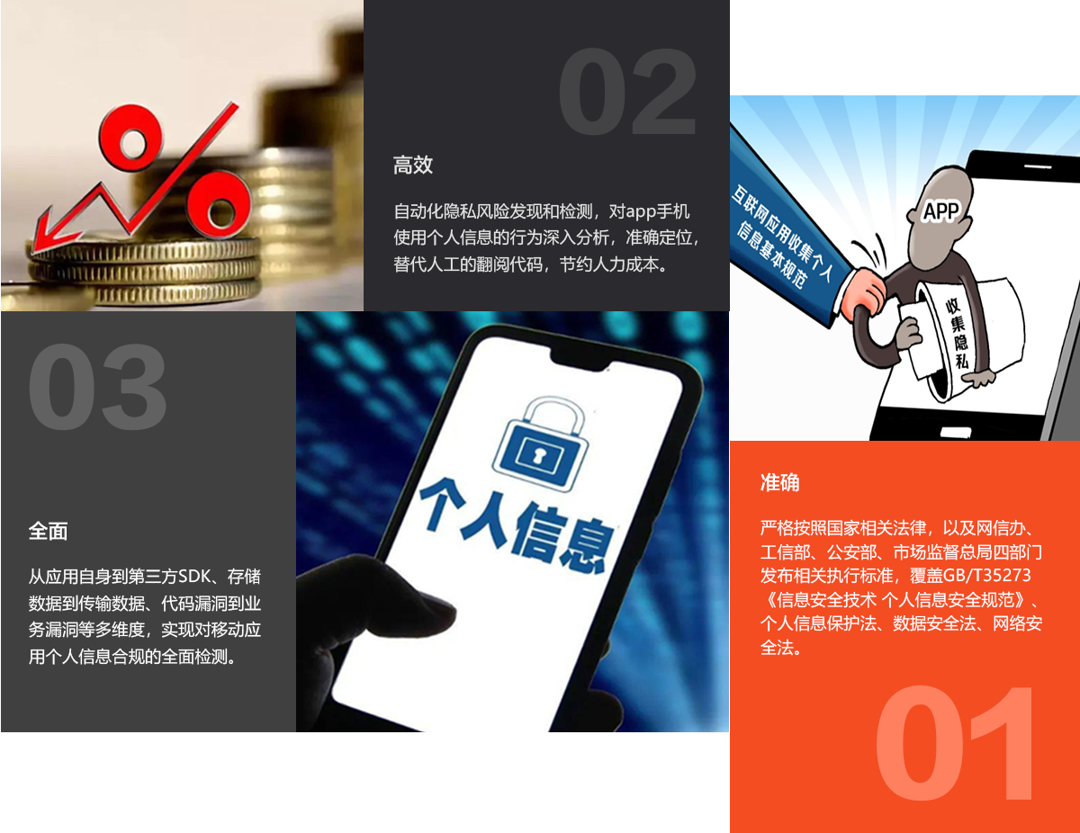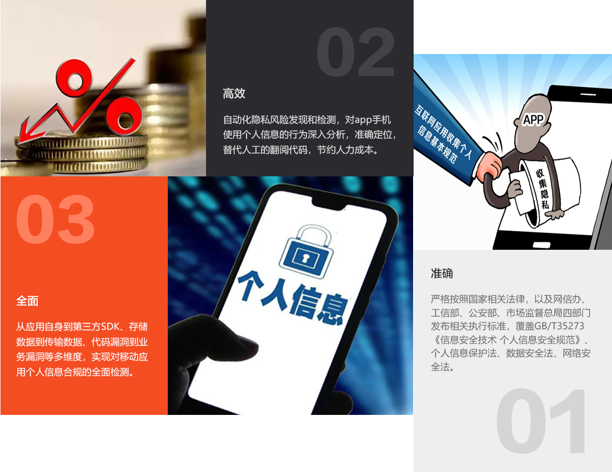 集APP安全与隐私合规两大核心功能,采用静、动态分析技术实现APK程序安全、数据安全、业务逻辑安全、组件安全、权限及隐私合规安全等200余项检测,降低APP安全漏洞风险和通报下架风险。