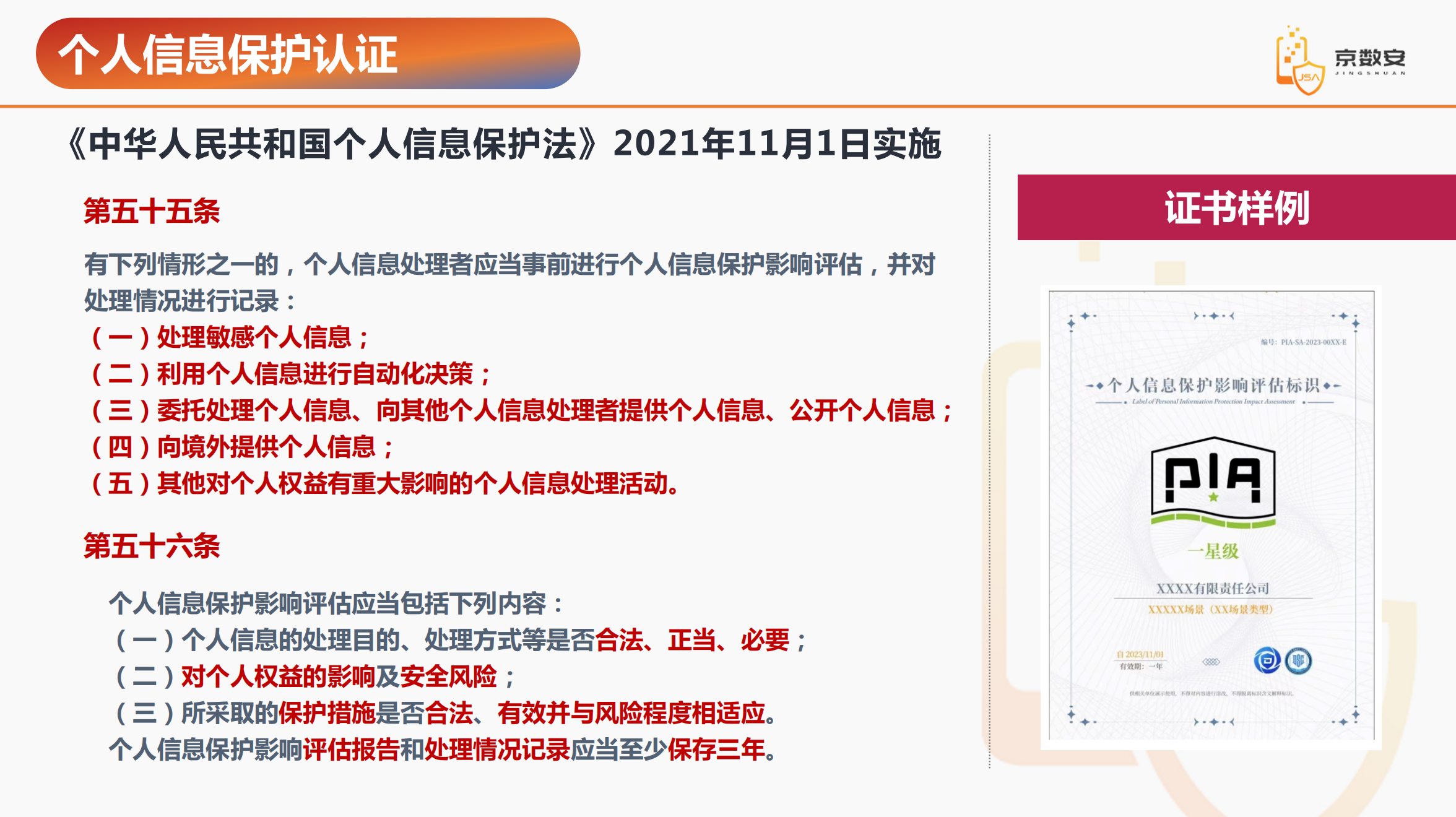 随着《个人信息保护法》(PIPL)、《数据安全法》(DSL)等法规的实施,企业需对个人信息处理活动进行合规评估,确保合法、安全地处理用户数据。京数安(北京)科技有限公司提供专业的个人信息保护影响评估服务,帮助企业满足监管要求,降低数据泄露和法律风险。